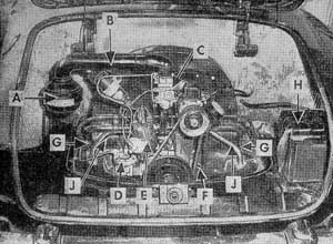 | Standard 36-horsepower, air-cooled, , flat-four opposed engine rides in rear compartment. To lower the deck in helping with Ghia's streamlining, the (A) air cleaner has been taken off the car top where, it rides in the VW and connected by a (B) long tube to the (C) carburetor. The air bleed let was also changed. Other parts' include (D) fuel Pump, (E) distributor, (F) crankcase oil Dip stick, (G) sparkplugs, (H) battery, and (G) engine mount braces. |