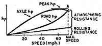 At low speeds (20-30 mph) it is the weight of the car that requires power; at about 40 mph, the roiling and the atmospheric resistance are about equal; but at 60 mph the atmospheric resistance is double the rolling resistance! (For American cars: 4000 lb., 25 ft^2 area). The typical form of the horsepower curve for the engine and gear train is also shown in the figure. Note' that the intersection "A" represents the maximum speed of the car. (Of course, a good tail wind will nudge this higher.) More available engine power at high engine speed also gives a higher speed. But the true engineering approach for efficiency is to reduce the drag coefficient (C) of the automobile by streamlining and, also, to reduce the frontal area (A). Although the foregoing equations are approximations, let us use them to calculate the top speed of the Ghia. W=1785 lb, A=20 ft^2, and HP =29.3 (axle horsepower according to our tests) Thus: The calculated answer is thus 72.5 mph. Our actual test result was 71 mph. And VW's claim for the Ghia is 72 mph. The closeness of our calculated answer attests that these approximate formulas are not too inexact at the low top speed of the Ghia. Note, too, in the figure, that the maximum brake horse-power developed by the engine can be attained at top speed only if point "A" coincides with the maximum-hp point. The rear-end gearing in most cars causes this to be true. But maximum car speed often occurs with the engine over its power peak (the case shown in the figure). A tail wind brings down the resistance curve and "A" shifts to higher speeds. A head wind raises the resistance curve and point "A" shifts to lower speeds. Incidentally, don't confuse the calculated top speed value given above with the MPH we list under Performance Factors. This MPH, corresponds to the advertised peaking speed of the engine - and it is j calculated from the advertised peaking speed and the 'rear axle ratio., It can be either greater or less than the maximum top speed obtained by test. If it agrees, then you, know you have essentially the right rear axle for top speed. |