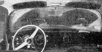 ![]() | Electric windshield wipers run at one fairly slow speed, but they overlap in center to eliminate blind spot usually found on domestic cars. Instruments include, left to right: Choke knob (top) ignition switch, speedometer, hood release knob (shows beneath horn button), clout, light switch, wiper switch. White knobs at far right and left control ventilators; radio fits in center. |