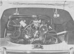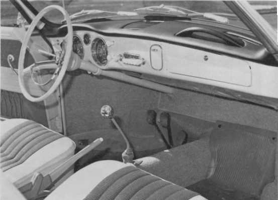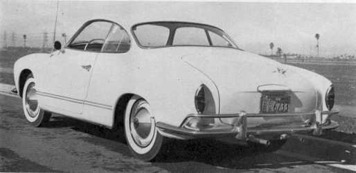 other situation the car is very pleasant to drive. In expressway driving there is very little to choose between one car and another9they all seem good9but when the going gets rough, cars with independent 4-wheel suspension show a marked superiority over their competitors. The K-G is no exception and takes freeways, ruts bumps and potholes with equal aplomb and little pitching as long as the dampers are good. The pitching action that does exist is almost identical to that of the parent Volkswagen but is not as noticeable because the driver sits closer to the pitch axis than he would in the sedan, where pitching movement is amplified. In designing the Volkswagen, Dr. Ing. Ferdinand Porsche utilized a front and rear suspension arrangement not too much different from that of the famous AutoUnion racing cars which came from his drawing boards and which also were powered by rear-mounted engines. All current Volkswagens retain the swing axle rear end (some sort of independent suspension is necessary with a rear-mounted engine ) and parallel trailing arm front suspension that has been a design feature of the Volkswagen since the first model. Transverse torsion bar springs are used all around, laminated square in front round at the rear, with tubular hydraulic shock dampers. As with all cars carrying a majority of the total vehicle weight on the rear wheels, there is a tendency to oversteer 9the degree of oversteer being determined to a great extent by the type of suspension employed. To help counteract the oversteering characteristics, a problem so serious on the racing cars that few drivers could ever make full use of the brutish 600 bhp available, Dr. Porsche designed a front suspension with the roll center at ground level, which contributes to an understeer condition. This minimizes, but does not completely negate, the oversteer caused by the rear end weight bias. Casting all theory and speculation aside, the Karmann Ghia is still a Volkswagen, with all that the phrase implies. It will carry two people, and their luggage, in reasonable comfort at a reasonable speed, and with economy and reliability. Not much more could be asked of it. |