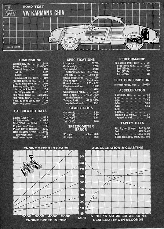 ![]() Road & Track conducted its first road test of a Karmann-Ghia Volkswagen in April 1956, shortly after its introduction, and said "This coupe is actually available for purchase, providing the customer is well supplied with patience. The statement is still valid today, although the wait is not quite as long as it was in 1956. We, too, have been waiting, not to buy one but to test a newer model, never expecting that, like the sedan, it would be continued (seemingly forever) with little or no change. There is, of course, a Karmann version of the VW-1500, which we will get to later, but this test car is merely a refined version of the one tested six years ago. Since the Karmann-Ghia's introduction it has almost seemed an orphan, due to the lack of effort put into advertising or promoting it, even though sold and serviced by all VW agencies. It is, in essence, a standard Volkswagen with more attractive bodywork (for approximately $700 dollars extra). Few changes have been made other than the usual and expected refinements that were also added to the sedan. In fact, every change and/or improvement made to the sedan has been incorporated into the K-G (wherever applicable) at the same time. Most important was the change in 1960 from 36 to 40 bhp, a seemingly insignificant amount when viewed as only a four horsepower gain, but it represents an 11% increase, which made the |