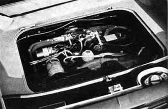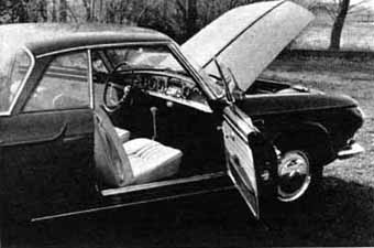 ![]() KARMANN-GHIA VW 1500 Porsches, these problems can be partly overcome by the installation of a special gasoline-type heater, which is an expensive and space-wasting solution. Corvair experience, however, seems to confirm that this difficulty is not easy to overcome with an air-cooled engine living at the rear of the passenger compartment. There are two sun visors, nicely padded, which conform to the concave shape of the roof. Folded down for use, they still permit a gap of half an inch between roofline and upper edge of sunblinds, so that a low sun spotlights straight into the driver's eyes. Karmann development engineers must have worn very dark sunglasses never to have noticed this fault. Noise insulation between engine and passenger compartment is improved and, in contrast to some reports we have seen, we have found the wind noise tolerable-4hough we don't deny that at higher speeds, a lower general noise level would make conversation easier still. Finally, a few words on details, which are of some importance on a "personalized" car like this. The armrest on the driver's door as in the way when working the steering wheel in a succession of corners: control of the excellent gearbox (on both cars) is less perfect than on the sedan, with a feel of more flexibility in the linkage; the windshield wiper is very good, fast enough for heavy rain, but noisy on a drying windshield.