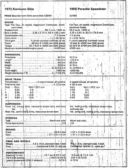 uh ... all-purpose if you know what I mean. But while the Speedster owner merely disdained all other cars, there was one in particular that was held in blackest contempt. Not just because what it was-which was a standard Beetle trying to pass itself off as a sports car - but because of what too many people thought it was - which was a Speedster being sold by VW. The Karmann Ghia! Foul poser. Pretender! Defiler! It was very much an emotional hatred, because in general, the Speedster had an uncomfortable similarity to the VW. After all, it was rear-engined, it had, that small light, quick steering feel. It had even been designed by Porsche himself. It certainly was no "Porsche," but it was undeniably closer than anything else on the road. And even if they didn't actually like the car, collectively the Speedster clan knew more about it than any comparable group of VW owners. They had to because of a fact that was kept well suppressed to all but insiders... there were a hell of a lot of VW parts that could be used as low-cost replacements for Speedster parts. Almost the day the first Speedster arrived, an underground telegraph sprang up to spread the word that, say, a VW transporter clutch would bolt right in at a third of the cost of a replacement clutch bearing the "Porsche" stamp. Or in a pinch, a $17.00 VW steering box could be used in place of the $80.00 real thing. Maybe that's why all Porsche owners of the time got slightly shifty-eyed when someone would innocently ask "A Porsche? That's the Volkswagen sports car, isn't it?" "No! It isn't! The Karmann Ghia is a VW!" would be the foam-flecked denial-even if the denier had just spent an afternoon hanging over a VW service desk to read the parts manual upside down. The worst part about this strain of Marque Chauvinism is that it is chronic. As with malaria: time and medication can lessen the severity of the attacks, but no one ever completely shakes it (See Steve Smith's accompanying biography if you doubt this fact). Even now, 13 years after the last Speedsters rolled off the line, former owners recall their Speedsters as the most enjoyable car they have ever owned... and still detest the Karmann Ghia. All right, all you guys, we'll get it over with right away... the 1972 Volkswagen Karmann Ghia is the Speedster re-incarnate. It does nearly everything the original did just as well - and many things it does better. , And don't think that we came by that decision easily... several members of this staff are former Speedster junkies who have had to face up to the fact too. And the fact is: All of a sudden after all those years, the goddamn Karmann Ghia doesn't seem so bad. Look at it! After 17 years in production, the Ghia has become such a familiar sight that hardly anybody ever really looks at it anymore. But, when you do look you see that its once galling similarity of silhouette is as close as any 1972 car dares come to the simple sheetmetal drape that Porsche laid over its 356 chassis to create the discount-price Speedster (sold in 1956 for $2995). Even with the addition of Department of Transportation-mandated chunky tail lights and sidemarkers, the Ghia, like the Speedster, gives the impression that it is wearing a size-too-small body... that the sheetmetal had to be stretched to cover the skeleton underneath. The result is an appreciated air of bulbous functionality rather than the extremes of neo-Thirties automotive classicism or ersatz Group 7 sculpturing that predominates elsewhere today. And better than just being visually reminiscent of the Speedster, the Ghia feels similar to sit in. And you do sit in it, which, as any Speedster owner will admit, was one of that car's greatest attractions. When you got into a Speedster you sank damn near out of sight. The car was low enough to begin with (most magazines of the time reported its overall height as 51 inches. Actual height was three inches less), but it felt even lower because of the very high door sills that meant you stepped over and down into the car. And once the door shut behind you, you found yourself eye level with a seven-inch high windshield and your shoulder just about level with the scantily cushioned top of the door. There was never any doubt that you were in the car - it was almost impossible to avoid the feeling that you were in command of a very mobile pillbox from which you could view the world perfectly over the twin bulges of the front fenders, while still remaining almost invisible yourself. The feeling of isolation naturally became even more pronounced with the top in place, and may have more than a little to do with the Speedster. (There are all kinds of stories of what went on inside top-up Speedsters parked on busy streets that have absolutely nothing to do with any of their intrinsic qualities as cars.) The Ghia creates very much the same environment, even though it comes equipped with a full-size windshield. You twist sideways through the narrow door openings and drop into the seat, and suddenly it's 1956 all over again. There's that same giant steering wheel an arm's length away and a vista of sheet metal rolling away from you in all directions. Even the wand-like shift lever is there with its long third-gear throw maybe three-quarters of an inch too far way. So too are the tightly grouped foot controls that allow you to accomplish the heel-and-toe maneuvers required of all sports car drivers. And from behind you comes the only slightly subdued sound of a small air-cooled motor, thrashing and-whirring-occasionally throwing in a syncopated clacking. It's all so familiar... but something just isn't right. It's the seat It's one of those VW straight-back chairs, mounted on hijacker seat rails that's throwing everything off. But even without going to new seats, it's possible to drop the OEM seats almost an inch and give the seat back some additional rake with a drill, hacksaw and some wooden blocks. Then try to say it's different. About all you can point to 